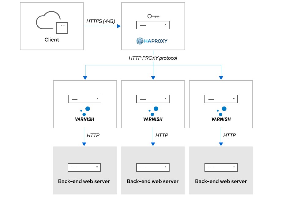 因为Varnish不能作为HTTPS终止程序工作,所以将HAProxy和Varnish一起使用是典型的配置。在这种设置中,HAProxy终止HTTPS连接,然后将流量以纯文本的形式转发给Varnish。Varnish将请求转发到后端web服务器,缓存响应,然后将它们发送回HAProxy以交付给web客户端。