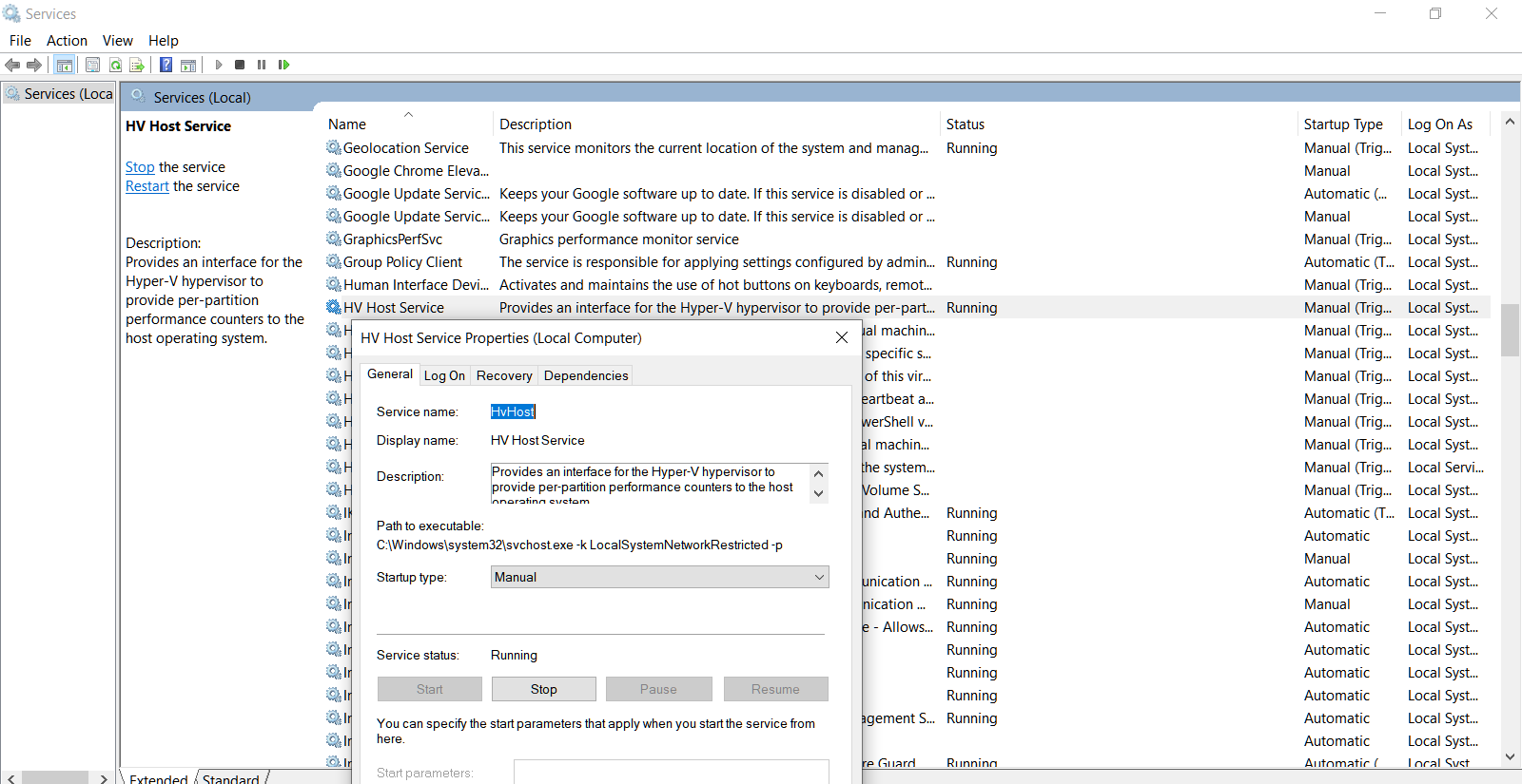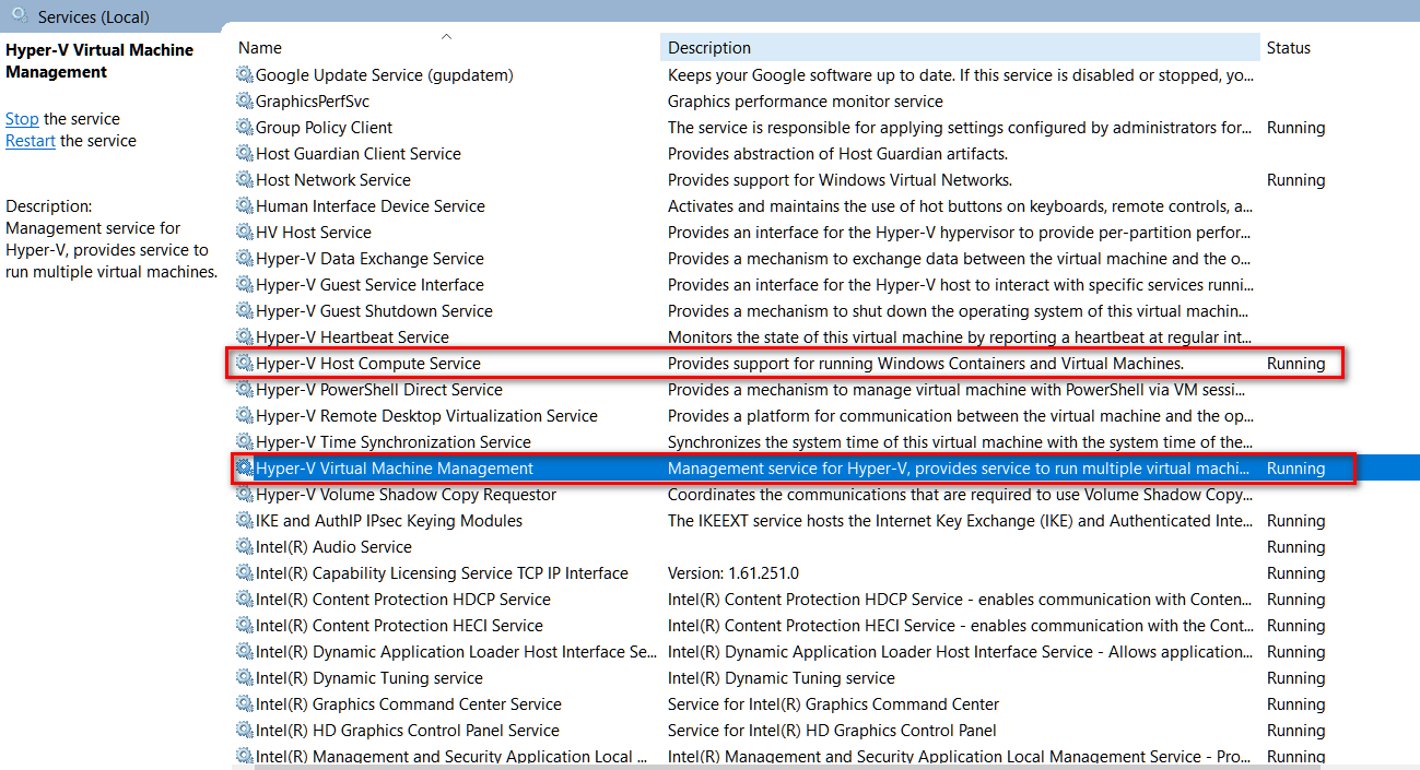 确保和Hyper V相关的服务,只有下列服务处于running状态: