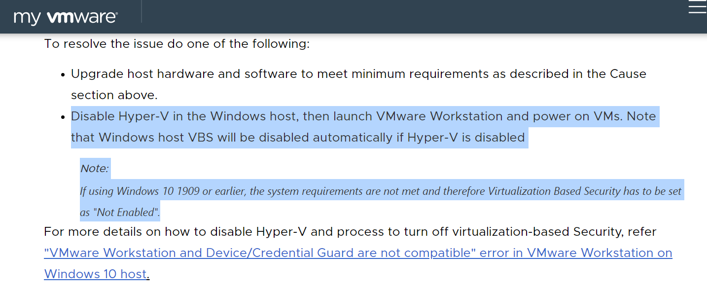 对于我这个Windows10版本,如果想使用VMWare workstation player 15.5.5,VMWare官网给出的解决方案是:在windows宿主机里禁掉Hyper-V,同时禁掉Virtualization-based Security(简称VBS):