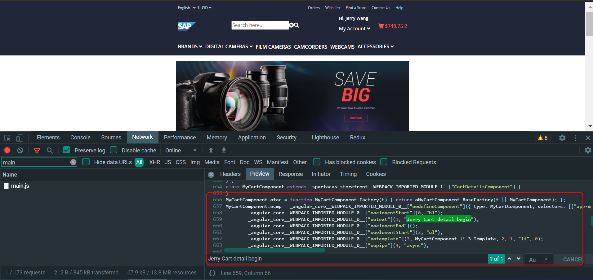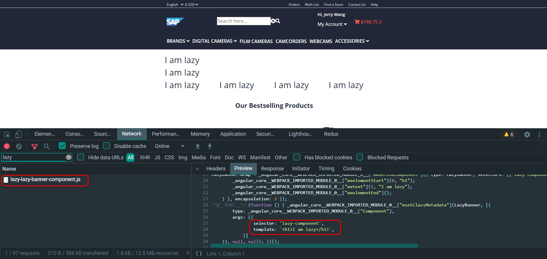 运行时,尽管客户仅仅访问了 SAP Commerce Cloud 首页,没有点击购物车,然而因为购物车自开发组件遵循的默认贪婪加载模式,因此其实现代码仍然被包含在了 main chunk 里,随首屏一并加载。