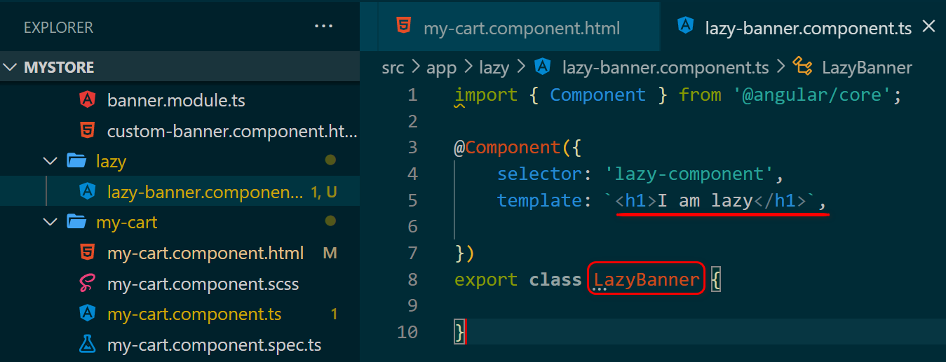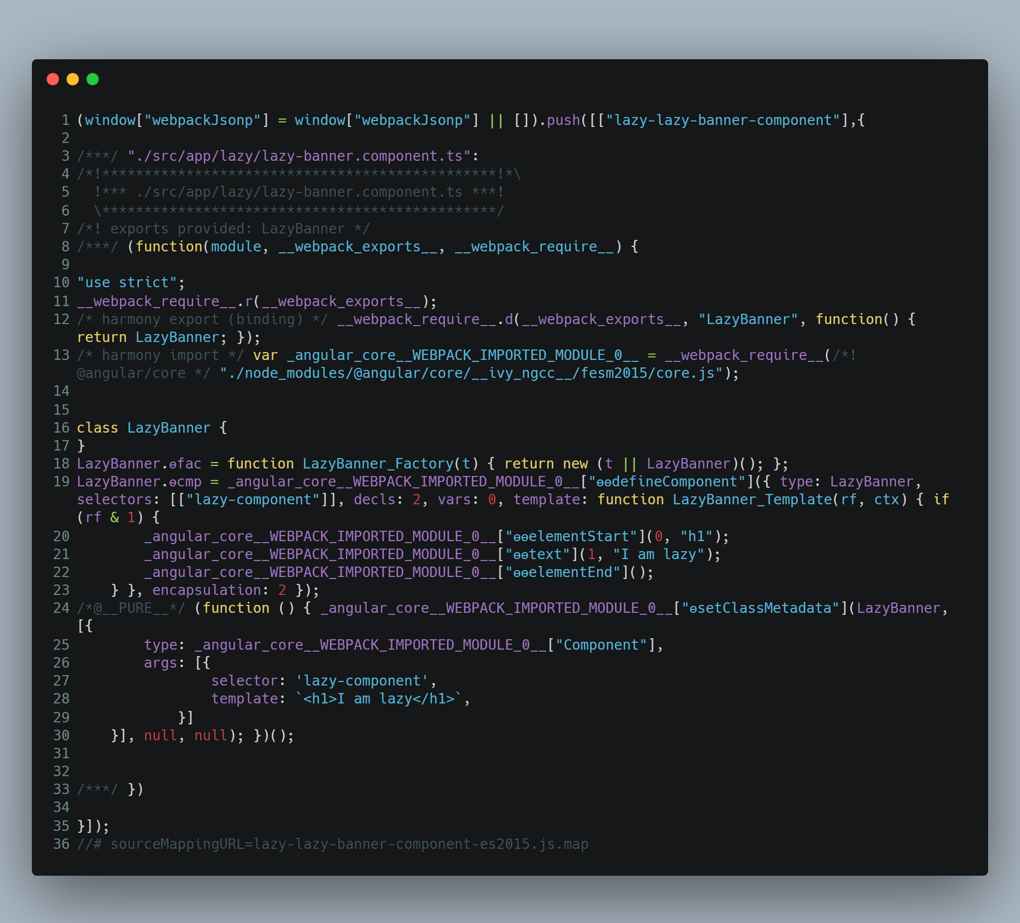 通过比较两种加载模式的代码能发现,利用 Angular 动态 import 语句,阻止了 builder 将 LazyBanner 组件的实现打包到 main chunk 的行为。