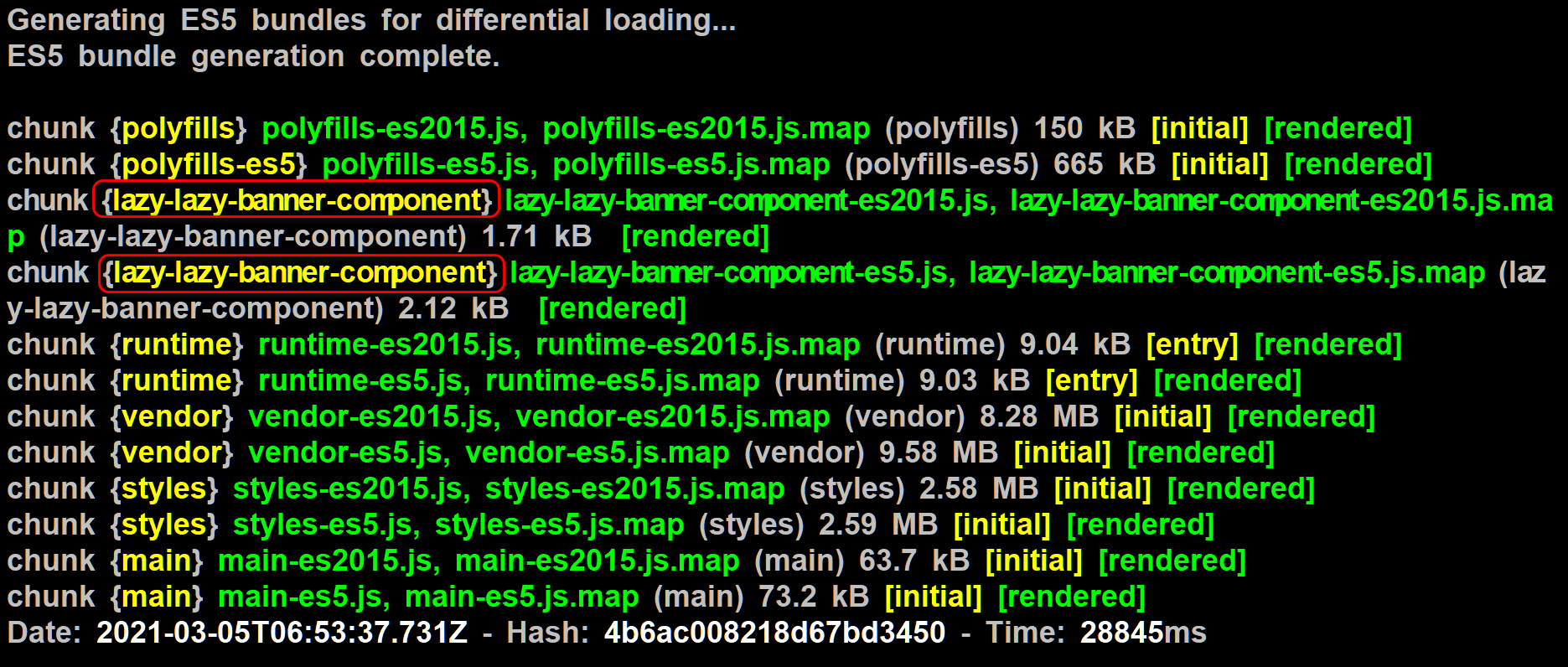 执行 ng build, 这次就能发现,LazyBanner 组件的实现已经和 main chunk 分开进行打包了,生成了一个单独的 chunk: