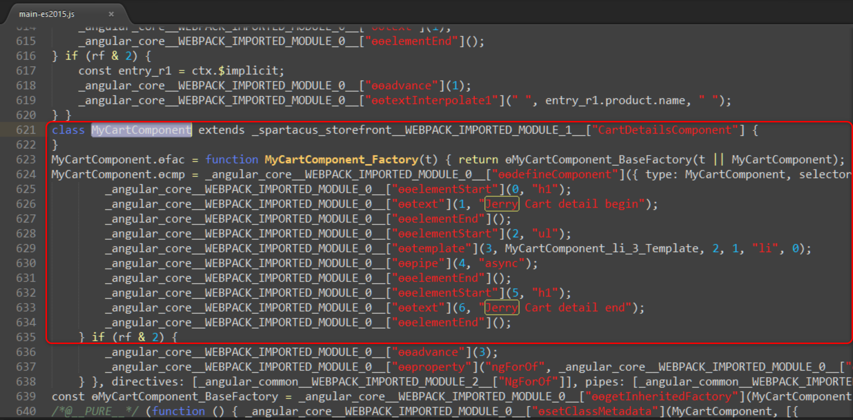被 Angular 编译器编译成 JavaScript 代码后,其对应代码能够在 main-es2015.js 里找到: