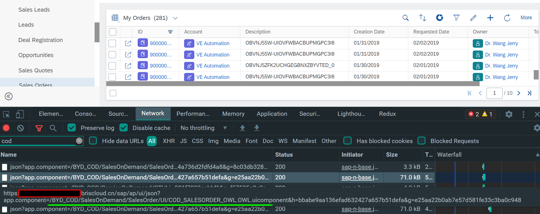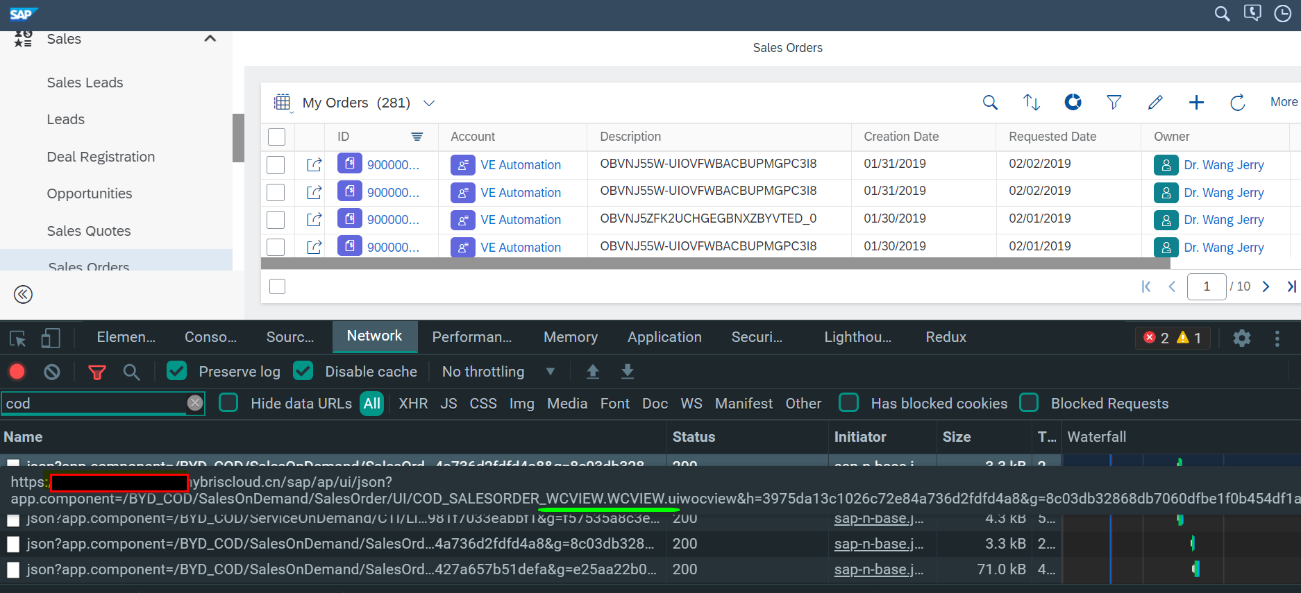浏览器打开Sales Orders工作中心视图之前,先开启Chrome开发者工具,切换到network标签页,然后进入Sales Orders搜索页面,在network 里观察到HTTP请求,其中包含WCVIEW.WCVIEW字符串的就是C4C前台从C4C后台读取Sales Order 工作中心视图的模型数据请求: