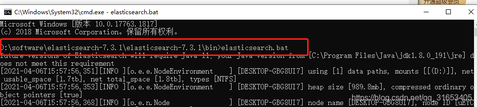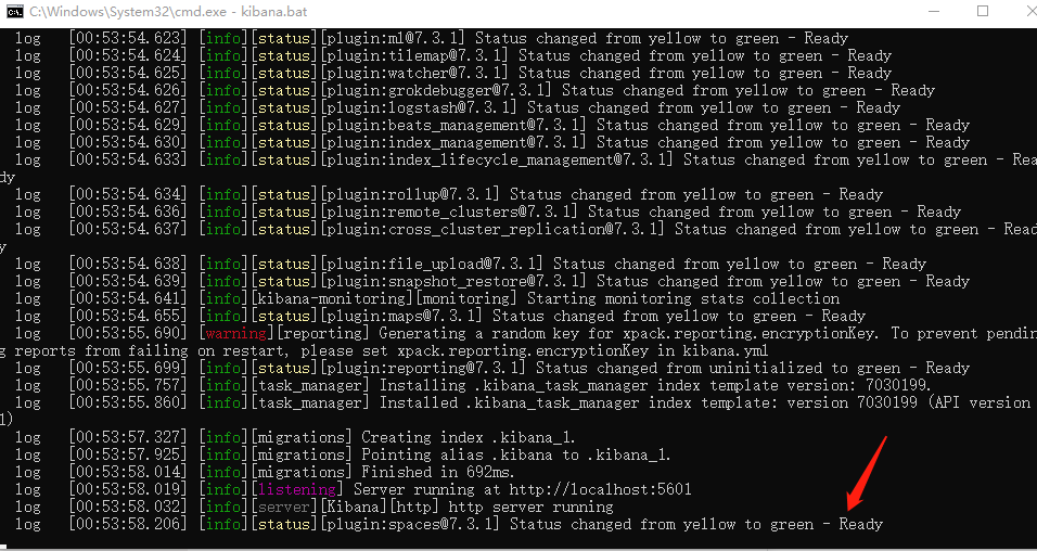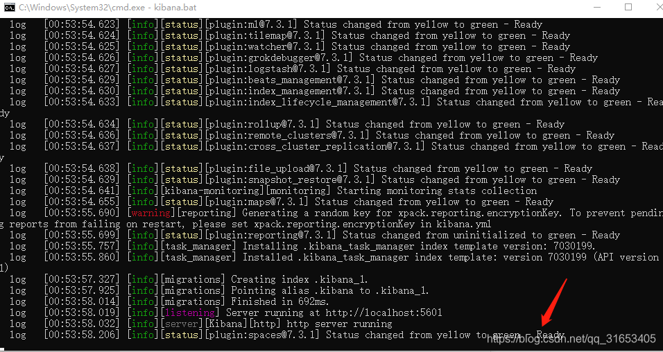 修改成功,启动.\bin\kibana.bat 如下:在启动kibana前一定要先启动es.bat