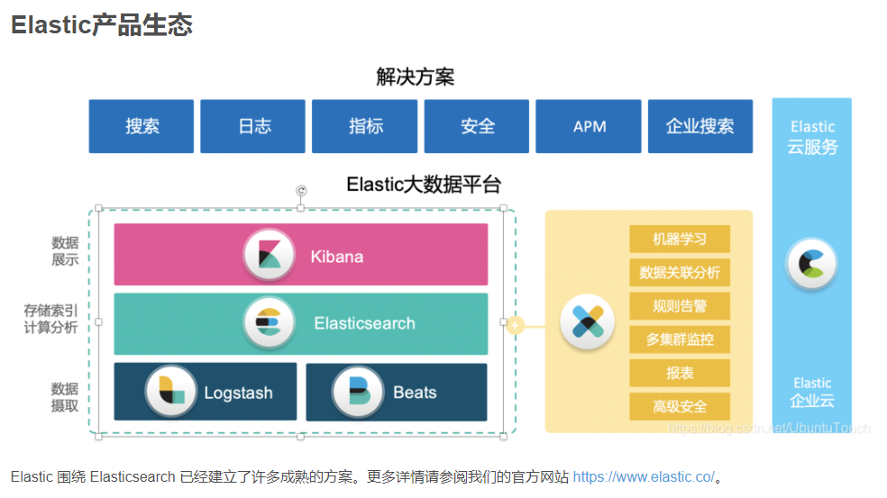 Elastic 公司也拥有 Logstash 及 Kibana 开源项目。这个三个开源项目组合在一起,就形成了 ELK 软件栈。他们三个共同形成了一个强大的生态圈。
