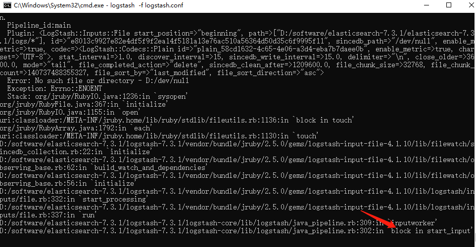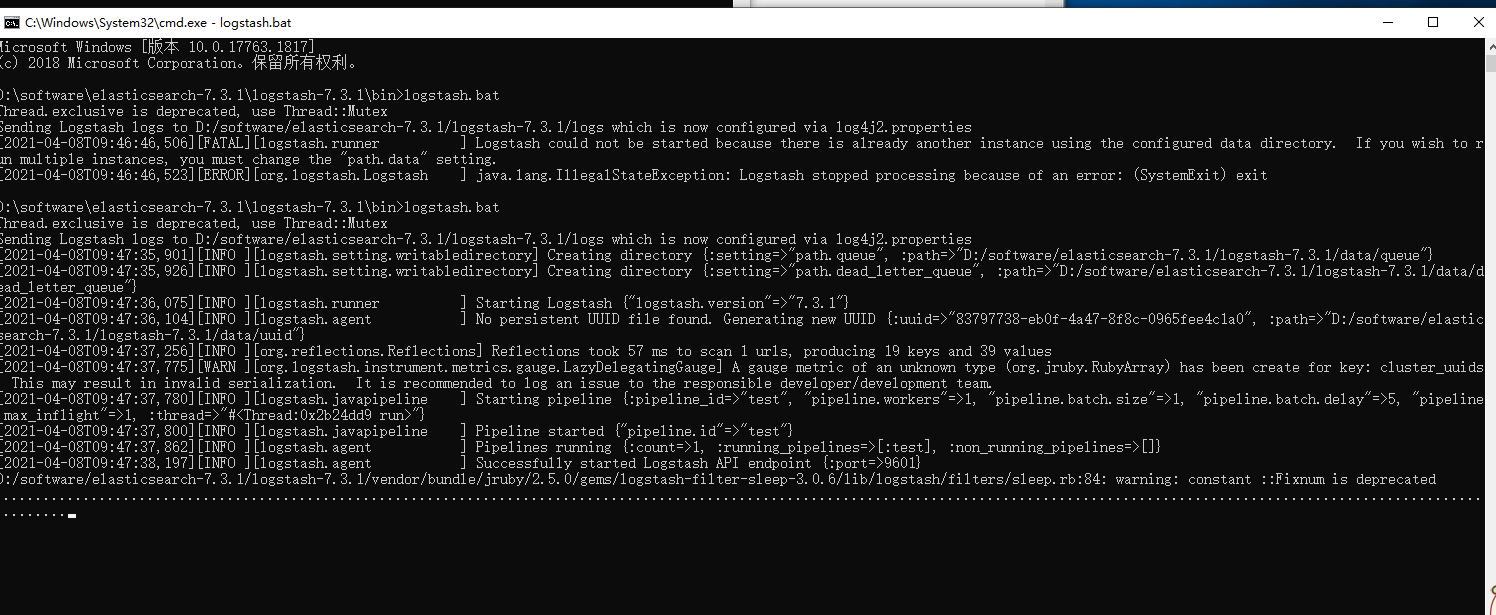 成功创建之后,cmd启动,logstash-7.3.1/bin/logstash.bat文件,配置完成后 读取logs文件,静静地等待中吧~