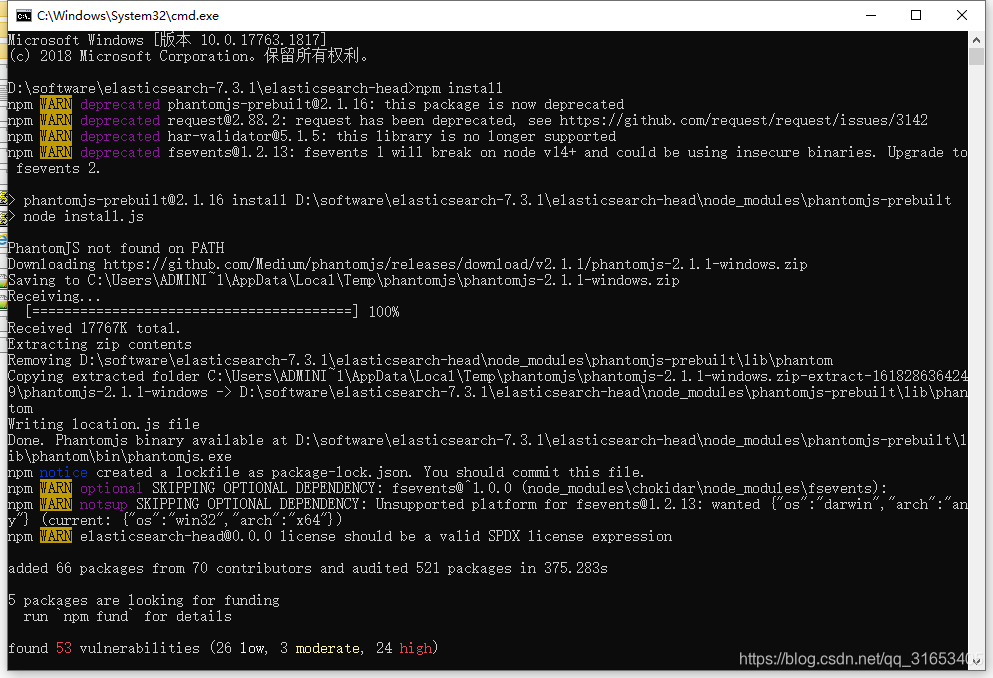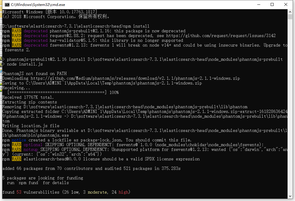 上面下载之后,进行解压,cmd 进入es-head 执行npm install命令 安装pathomjs,时间过长,静静等待即可