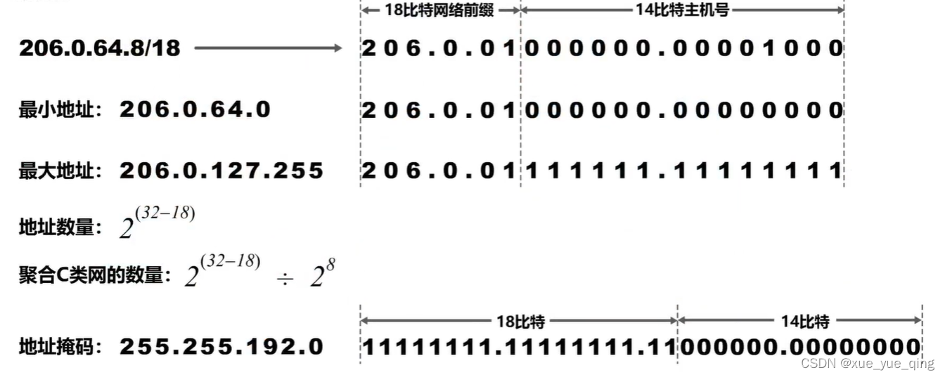 例如:请给出CIRD地址块206.0.64.8/18的全部细节(最小地址,最大地址,地址数量,聚合c类网数量,地址掩码)