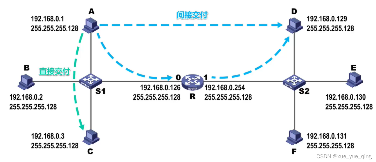 若在同一个网络中就是直接交付,若不在同一个网络中则为间接交付