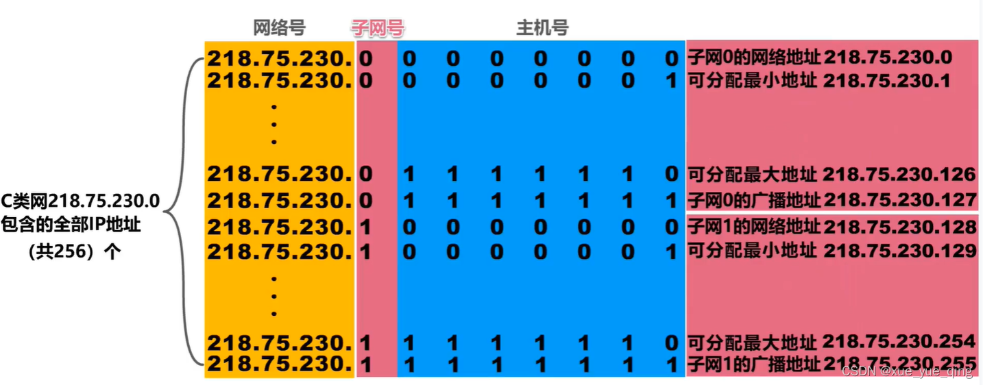 例如:已知某个网络的地址为218.75.230.0,使用子网掩码255.255.255.128对其进行子网划分