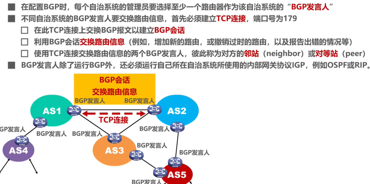 BGP发言人交换网络可达性的信息(要到达某个网络所要经过的一系列自治系统)