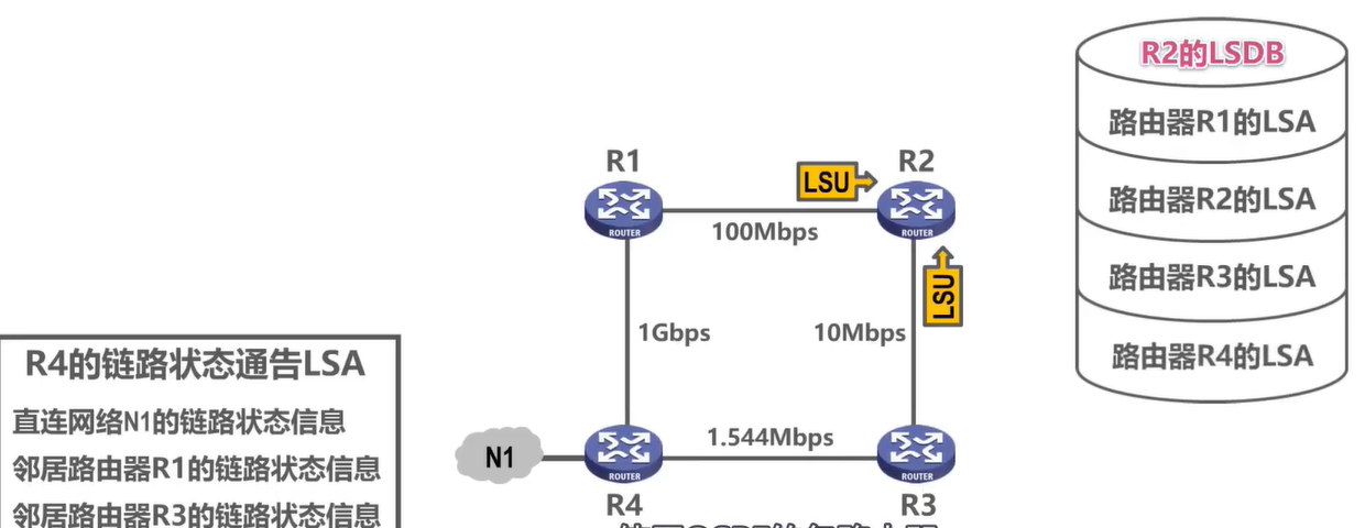 使用OSPF的每个路由器都有一 个链路状态数据库LSDB,用于存储LSA。