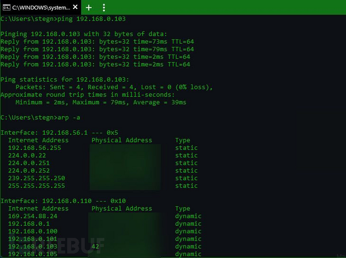 完成后,键入arp -a以显示与你的 PC 连接的所有设备的 IP 和 MAC 地址信息。