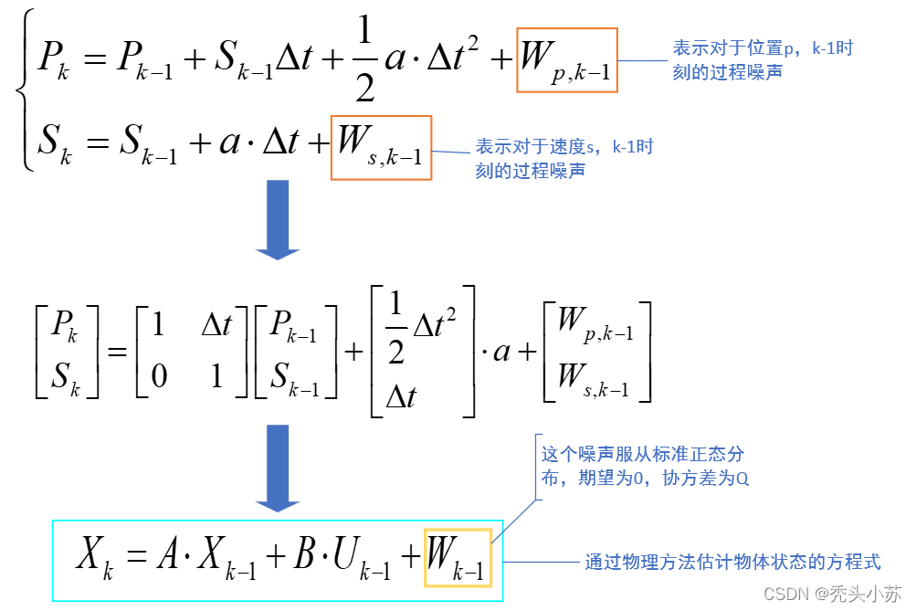 我们令 ,则 。令 、 、 。Xk称为状态向量,A称为状态转移矩阵,B称为控制矩阵,Uk-1称为状态控制向量。【注意这里的运动为匀加速运动,即a不变,则Uk=Uk-1=a】。则上式可变成如下形式: