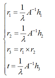 通过上面的一系列运算,我们算是把相机的内参矩阵求出来了,对于外参矩阵,我们很容易通过下面的矩阵进行求解: