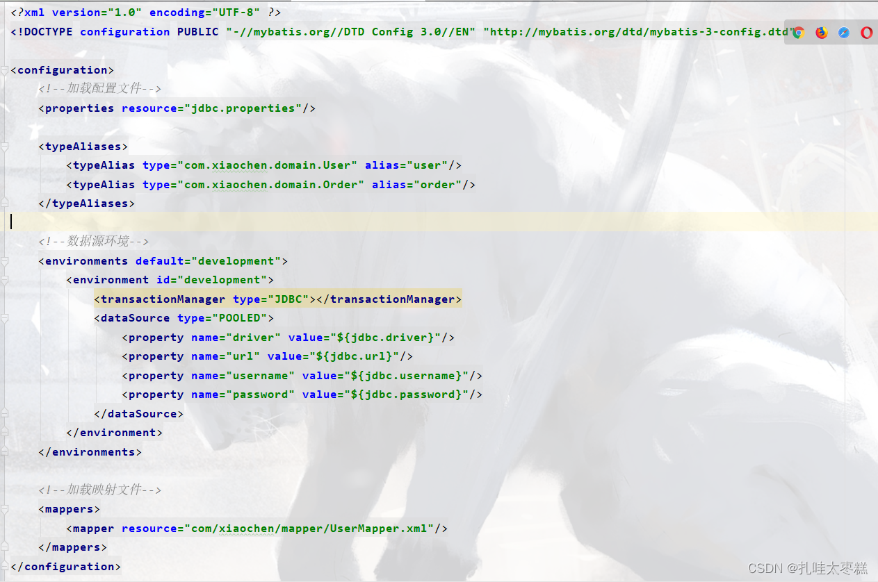 第三步:配置核心配置文件,这里的加载mapper映射文件和上一个案例不一样,其他配置都一样