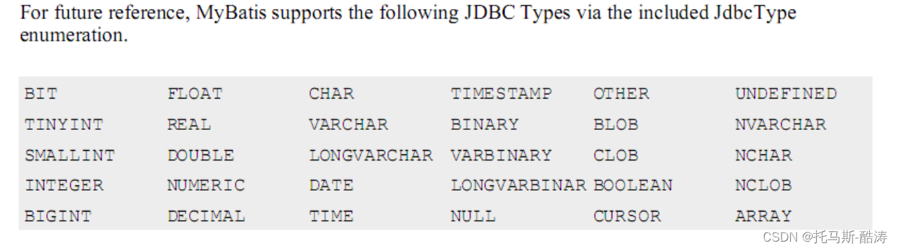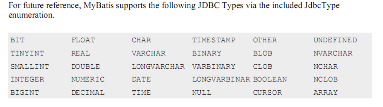 jdbcType=数据类型名称 } javaType, jdbcType 的类型 MyBatis 可以检测出来,一般不需要设置。常用格式 #{ property }