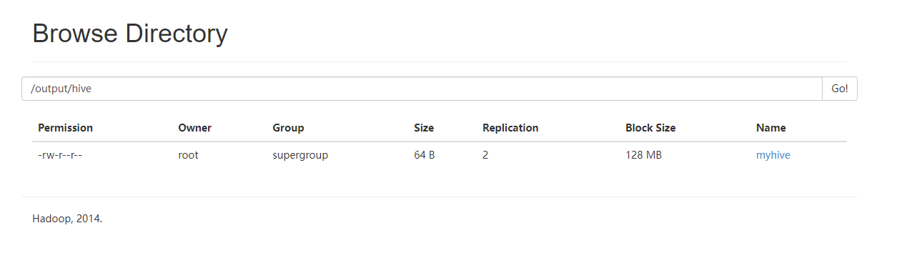 -rw-r--r-- 2 root supergroup 64 2022-03-05 22:19 /output/hive/myhive
