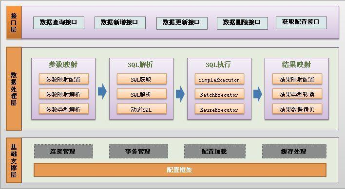 3、基础支撑层:负责最基础的功能支撑,包括连接管理、事务管理、配置加载和缓存处理,这些都是共用的东西,将他们抽取出来作为最基础的组件。为上层的数据处理层提供最基础的支撑。
