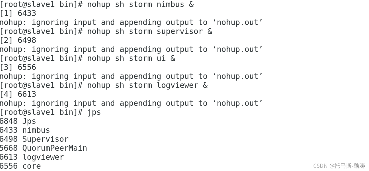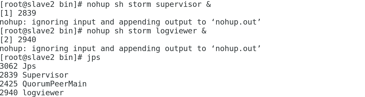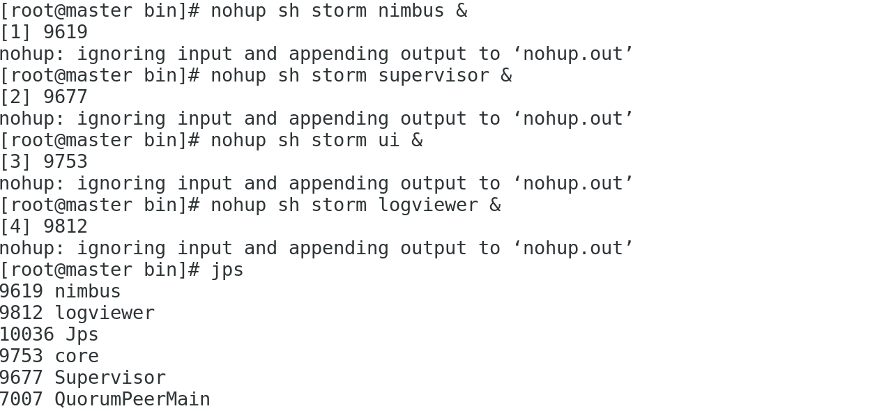 1、启动master和slave1的主节点 nimbus服务(注意上面的配置文件):