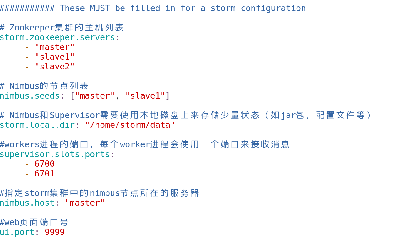 nimbus.seeds: ["master", "slave1"]# Nimbus和Supervisor需要使用本地磁盘上来存储少量状态(如jar包,配置文件等)
