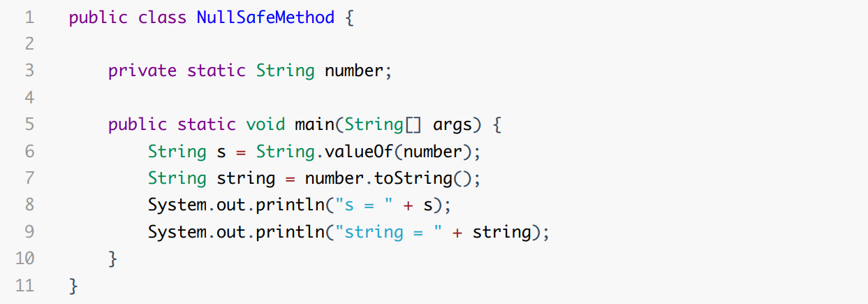 number没有赋值,所以默认为null,使用String.value(number)静态方法没有抛出空指针异常, 但是使用toString却抛出了空指针异常。所以尽量使用对象的静态方法。