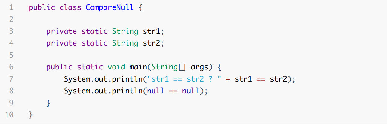 你可以使用==或者!=操作来比较null值,但是不能使用其他算法或者逻辑操作,例如小于或者 大于。跟SQL不一样,在Java中null == null将返回true,如下所示: