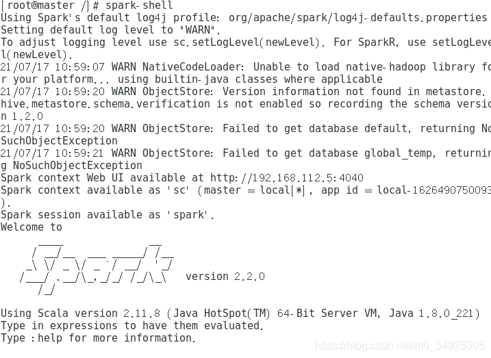 (10)测试运行“spark-shell”命令,查看spark是否成功安装。