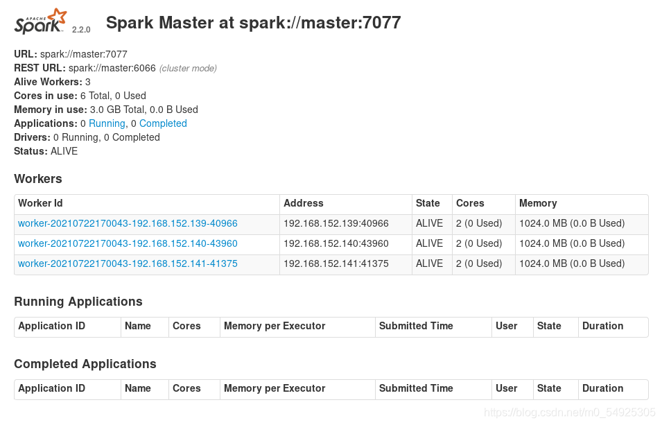 (6)在master所在机器的虚拟机浏览器地址栏中输入“master:8080”查看网页spark管理页面。
