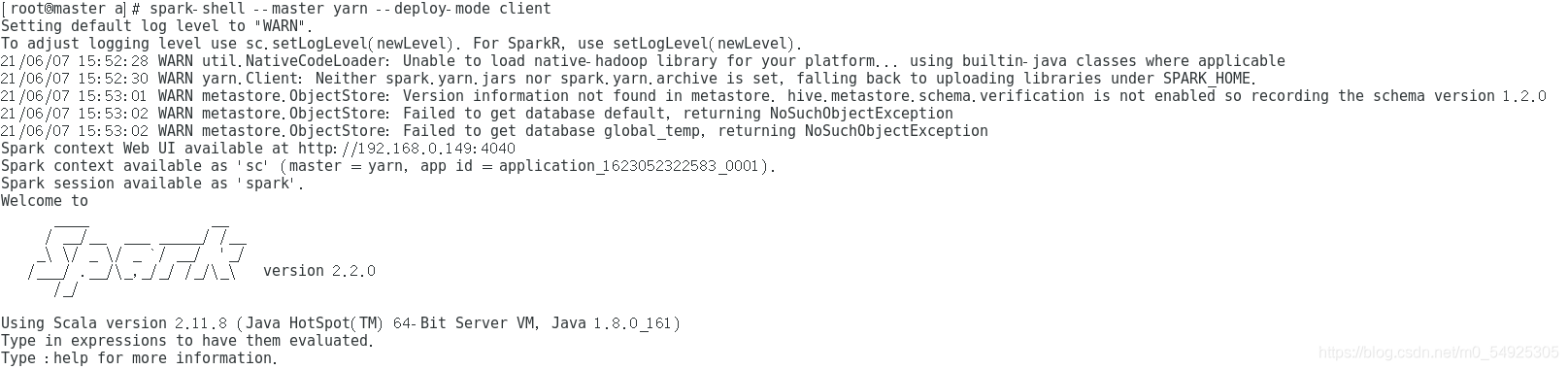 (5)使用命令“spark-shell --master yarn --deploy-mode client”来启动Spark shell。