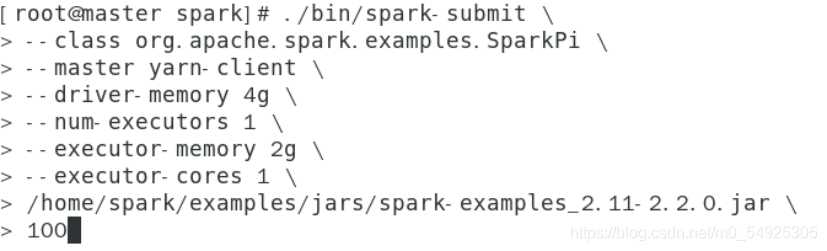 (8)向独立集群管理器提交应用,需要把spark://master:7077作为主节点参数传递给spark-submit命令。可以运行Spark自带的样例程序SparkPi,它的功能是计算得到pi的值。在Linux Shell中执行如图的命令运行SparkPi(jar包可以使用Tab键进行补全),得到如图所示的结果。