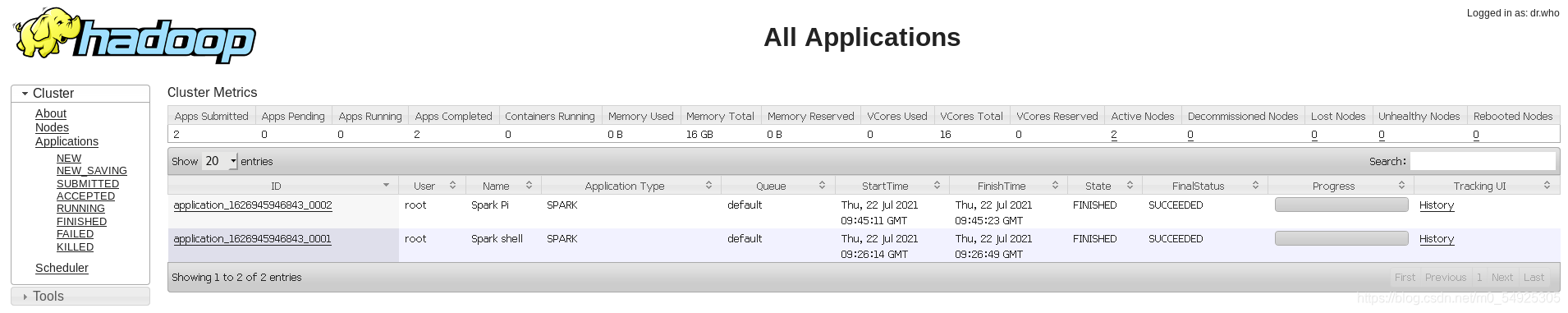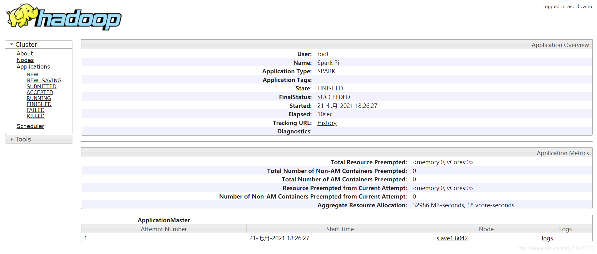 (9)查看Spark的webUI,在虚拟机浏览器地址栏中输入“master:8088”,查看是否成功上传PI,如图所示。