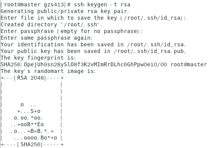 执行命令“ssh-keygen -t rsa”并且依次在系统等待输入时直接回车(一共4次回车)后,即可生成密钥对,如图所示。