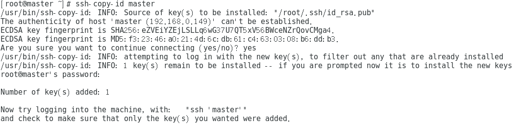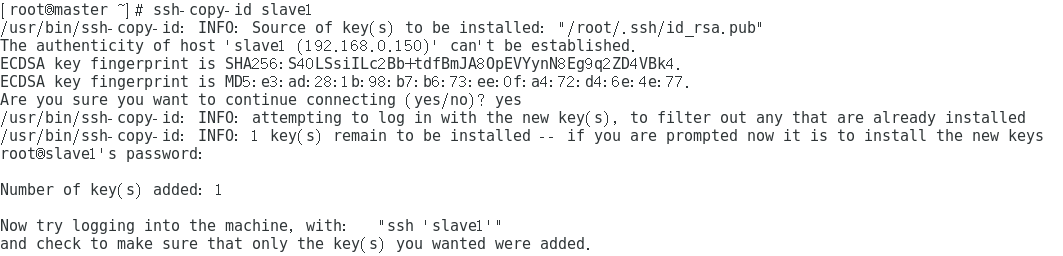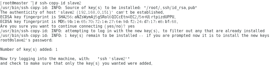 在各Slave节点上,需要注意的是执行“ssh-copy-id [主机名]”命令时,需要更换[主机名]为“master”,“slave1”或“slave2”。