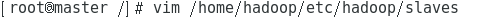 (2)配置slaves文件,执行命令“vim /home/hadoop/etc/hadoop/slaves”将master节点仅作为NameNode使用,将slaves文件中原来的localhost删除,并添加内容,如图所示。(注意文件内容不能留有其他空格)