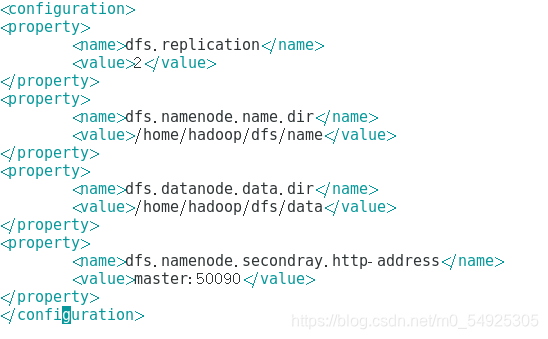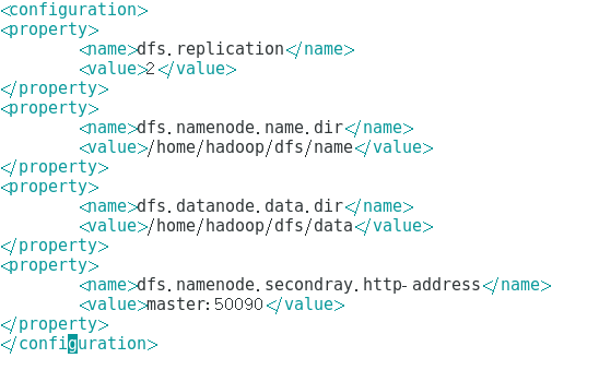 在配置集群模式时,需要修改“/home/hadoop/etc/hadoop”目录中的配置文件,这里仅设置正常启动所必需的设置项,包括slaves、hadoop-env.sh、yarn-env.sh、core-site.xml、hdfs-site.xml、mapred-site.xml、yarn-site.xml共7个文件,更多设置项可查看官方说明文档。