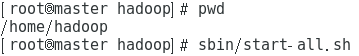 接下来即可启动Hadoop,在主机master上执行命令“sbin/start-all.sh”,启动进程,如图所示。
