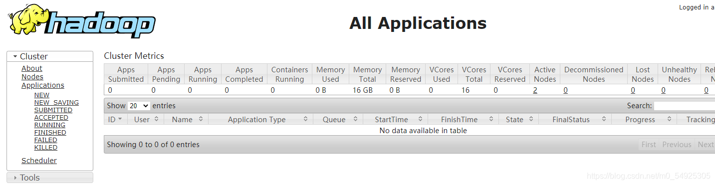 测试YARN,在虚拟机浏览器地址栏中输入“http://master:8088”,打开Web控制台,可以查看集群状态,如果DataNode中没有配置yarn-site.xml,则在网页中无法看到节点信息;如果配置了yarn-site.xml,则在网页中将会看到节点配置信息,如图所示。