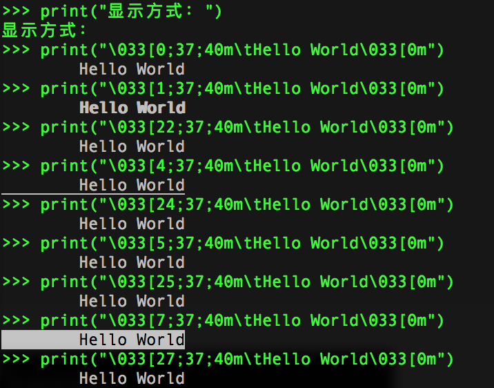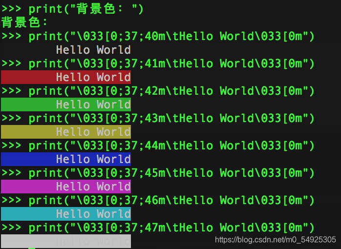 \033[显示方式;前景色;背景色m + 结尾部分:\033[0m