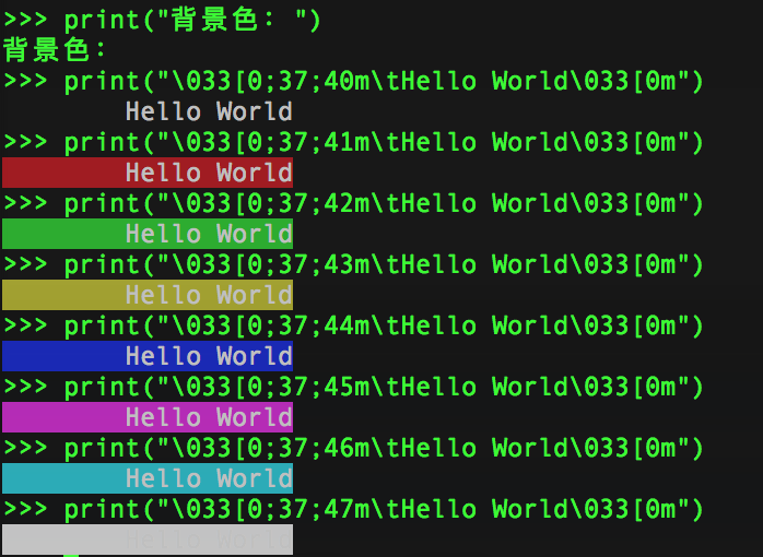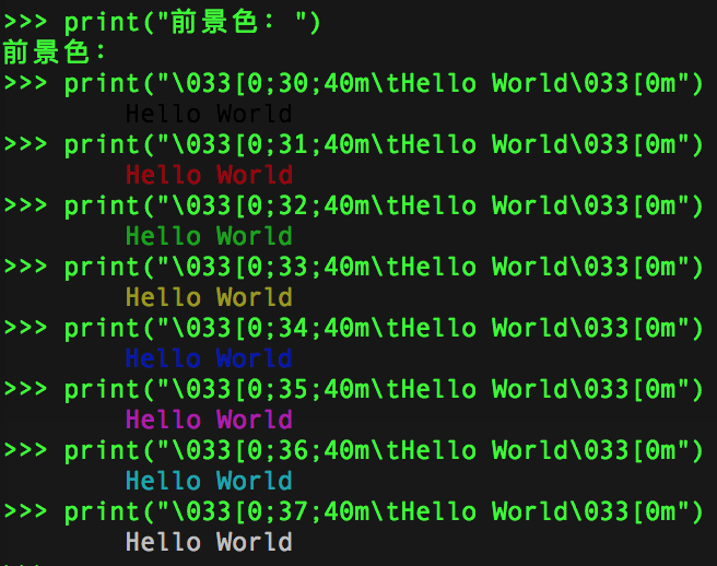 前景色: 30(黑色)、31(红色)、32(绿色)、 33(黄色)、34(蓝色)、35(洋 红)、36(青色)、37(白色)