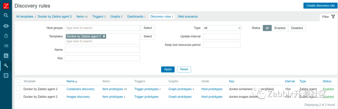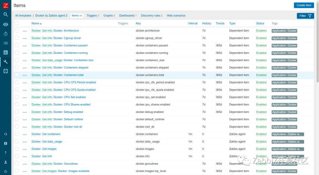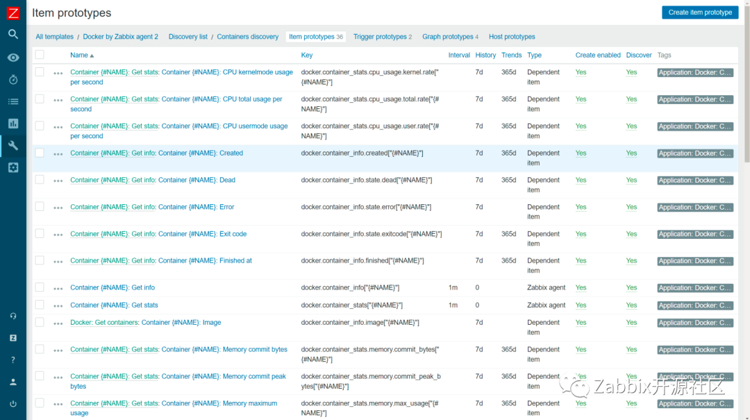 规则采集容器和特定镜像的信息。一旦 Zabbix 发现了你的容器和镜像,这些LLD(低级别发现)规则将通过原型为每个容器和镜像创建监控项、触发器和图形。通过这种方法实现容器和特定镜像的指标监控,例如:容器内存、网络信息、容器状态等等。