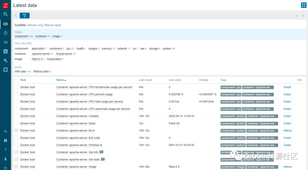 我们可以看到 Zabbix 将发现并监控两个容器—apache-server and mysql-server。任何代理的LLD(低级别发现)规则或监控项都可以用 zabbix get 进行检查.