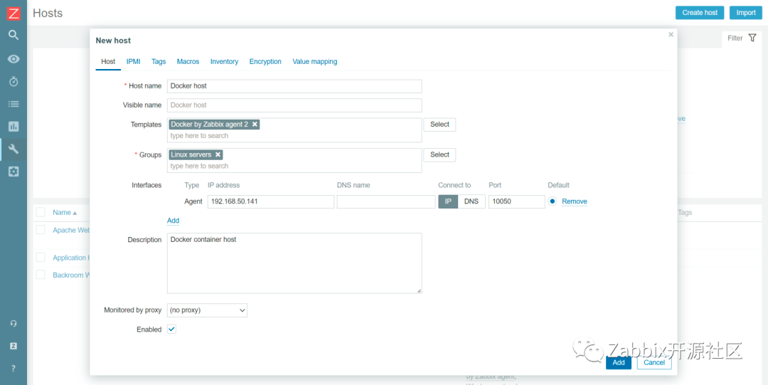 导入模板之后,我们需要为Docker实例创建一个主机。设置主机名并分配主机组——我将把它分配给 Linux servers主机组。将 Docker by Zabbix agent 2模板关联到该主机。因为要使用Zabbix agent2模板来采集数据,所以需要在这个主机上添加一个代理接口。接口的地址是运行 Docker 容器的机器地址。单击 Add 按钮完成主机配置。