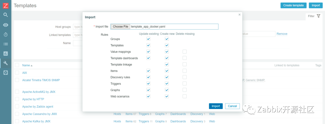 因为要使用官方模板Docker by Zabbix Agent2。首先,我们需要确保这个模板在 Zabbix 中是可用的。Zabbix 5.0、5.4和6.0中都提供了该模板。如果你在 * 配置->模板 中没有找到这个模板,很有可能是你在升级完Zabbix版本之后,没有将它导入到你的环境里。请记住,Zabbix 在升级过程中不会修改或导入任何模板,因此我们必须手动导入模板。这样的话,只需要从官方Zabbix git(或者直接点击这里)下载并通过使用 配置->模板 页面中的 Import 按钮将其导入到 Zabbix 实例中。