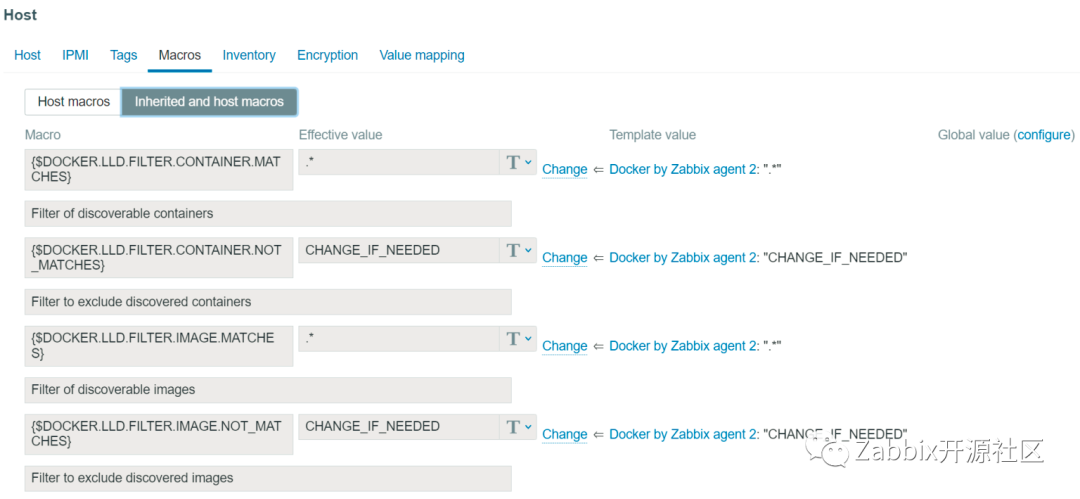 最后,有一些额外的选项能够进一步修改模板和LLD(低级别)发现的结果。如果你打开主机的宏并选择继承主机宏,你将看到从 Docker 模板继承了4个宏。这些宏用来过滤发现的容器和图像镜像。如果你希望根据自己的需求过滤这些被发现的实体,可以灵活修改这些值。