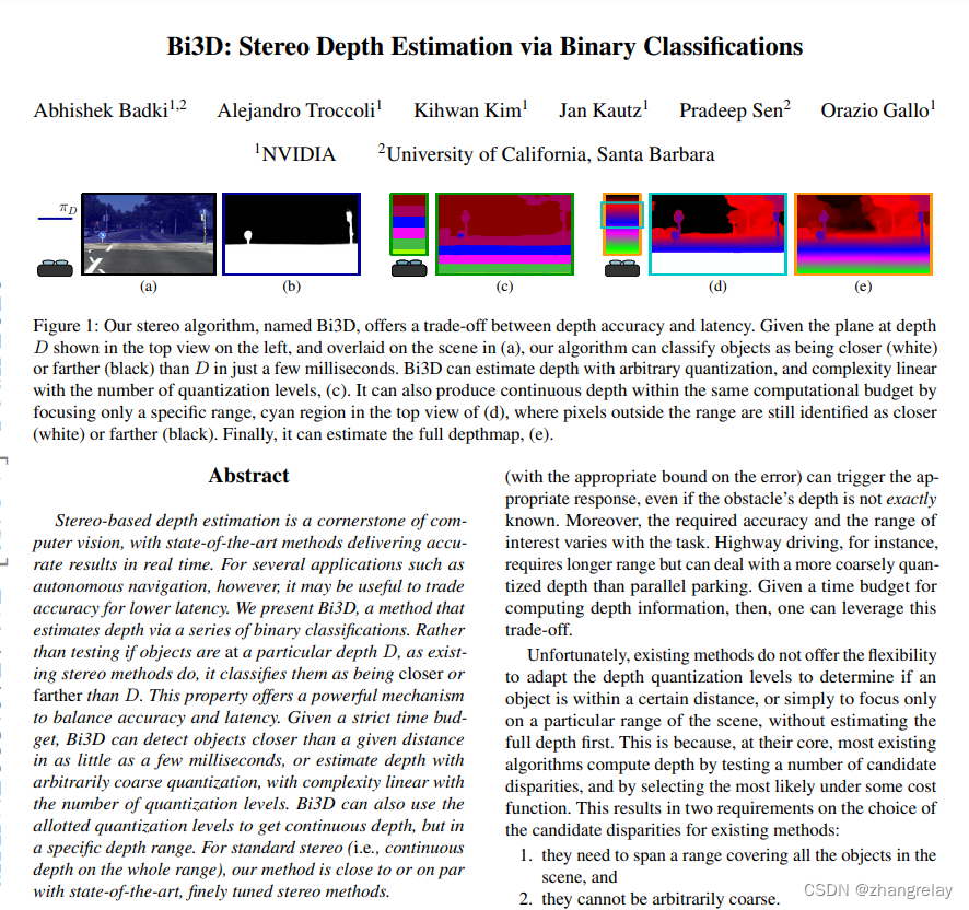 基于立体的深度估计是计算机视觉的基石,最先进的方法可以实时提供准确的结果。然而,对于自主导航等多种应用,以准确性换取较低的延迟可能很有用。我们提出了 Bi3D,一种通过一系列二元分类估计深度的方法。它不像现有的立体方法那样测试对象是否处于特定深度 D,而是将它们分类为比 D 更近或更远。这个属性提供了一种强大的机制来平衡准确性和延迟。给定严格的时间预算,Bi3D 可以在短短几毫秒内检测到比给定距离更近的物体,或者通过任意粗略量化估计深度,其复杂性与量化级别的数量成线性关系。 Bi3D 还可以使用分配的量化级别来获得连续的深度,但在特定的深度范围内。对于标准立体声(即整个范围内的连续深度),我们的方法接近或与最先进的微调立体声方法相当。