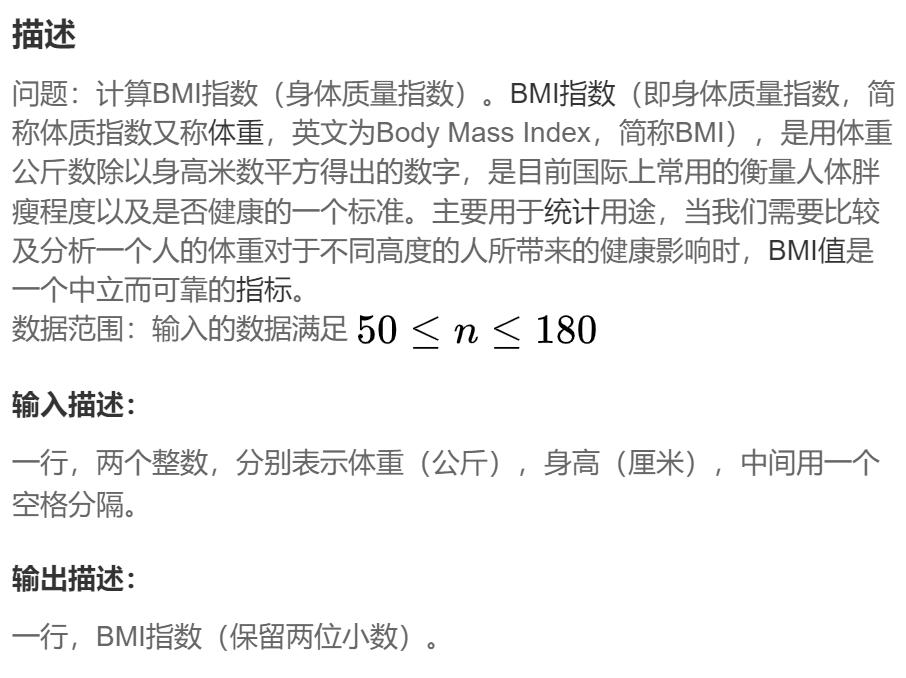 原题链接:计算体重指数_牛客题霸_牛客网