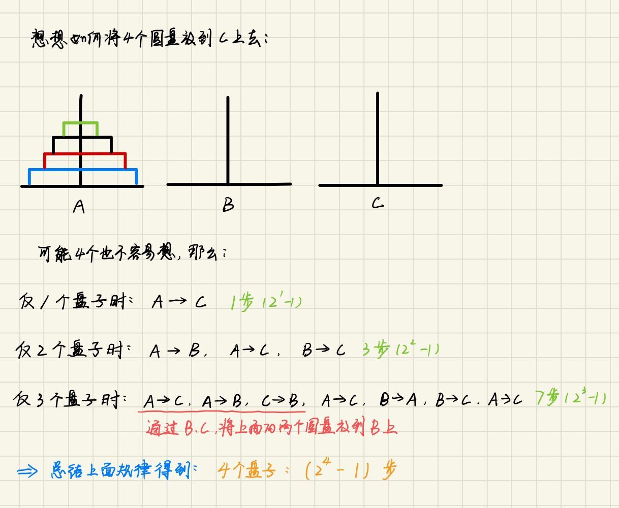 将A柱上面的4个圆盘放到C柱上,可以先通过B、C将4个盘子上面的3个移动到B上去,然后将大盘放到C上,最后通过A、B重复操作将那3个盘子放到C上。