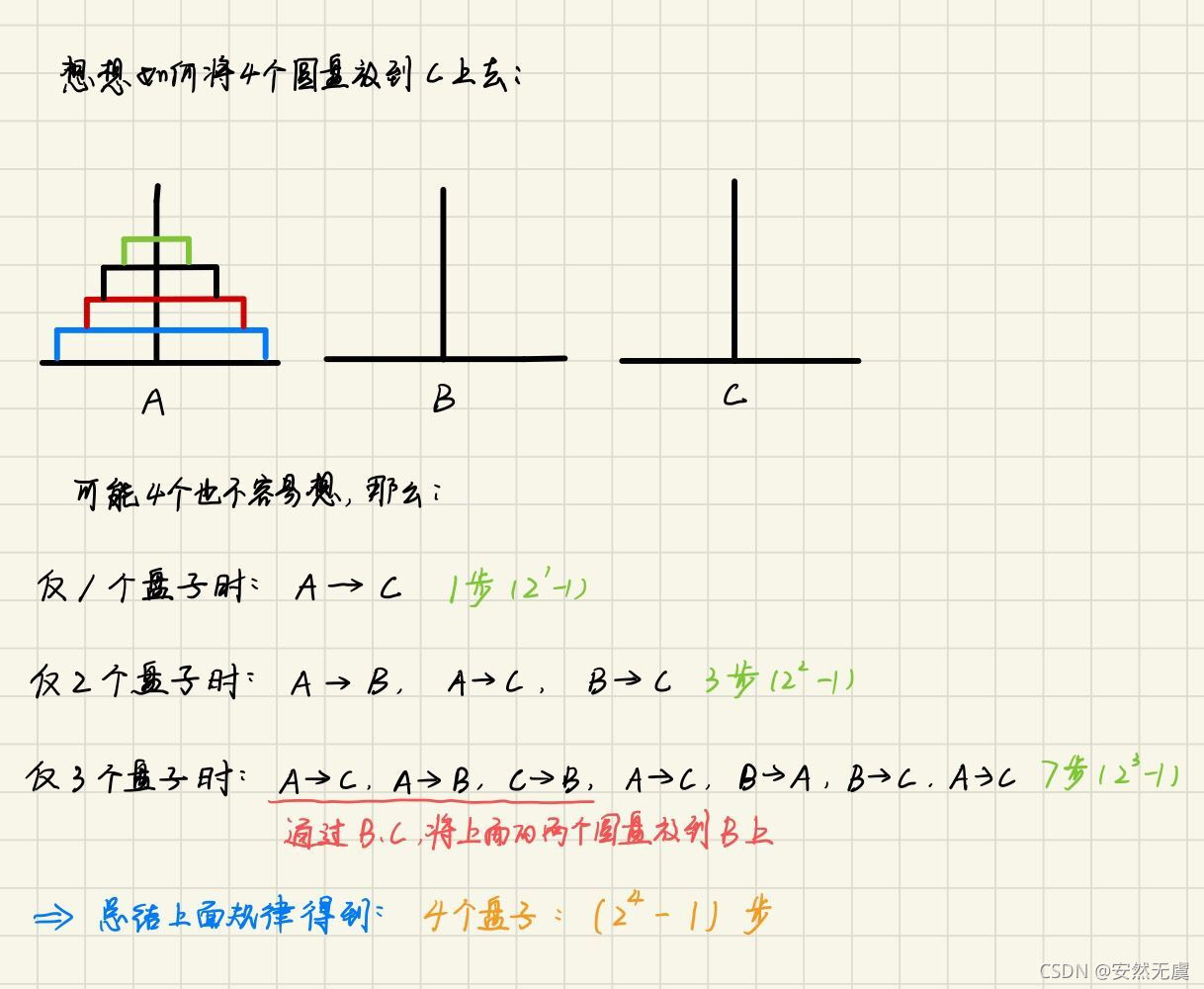 注意事项:一定不要想着去展开代码,做递归题目要学着横向思考。还是那句话,多做,多练,多敲。这道题目为了让大家理解怎么拿,怎么放,所以就没有真正去实现,否则还会用到后面一个模块的知识,在后面的博文中会做详细介绍。